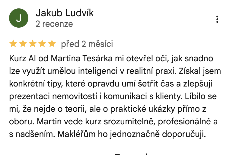 Martin Tesárek je jeden z nejznámějších realitních makléřů v Česku, specialista na marketing a moderní technologie v realitách. Od roku 2010 prodal více než 540 nemovitostí v hodnotě přes 1,4 miliardy korun a posledních 10 let školí makléře napříč republikou, jak zvýšit efektivitu práce a získat více zakázek díky chytrému marketingu. Jako jeden z prvních makléřů v ČR začal systematicky používat umělou inteligenci v praxi — od tvorby obsahu, přes automatizaci, až po právní přípravu podkladů. Tento AI playbook vytvořil proto, aby makléřům ukázal konkrétní postupy a nástroje, které mu samotnému každý týden šetří desítky hodin práce a dávají mu jasnou konkurenční výhodu.