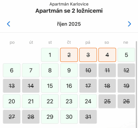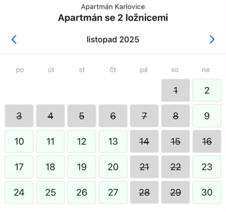 👉 Odjezd ale může být i v den označený šedě nebo červeně, protože ten už je blokovaný pro příjezd dalšího hosta.