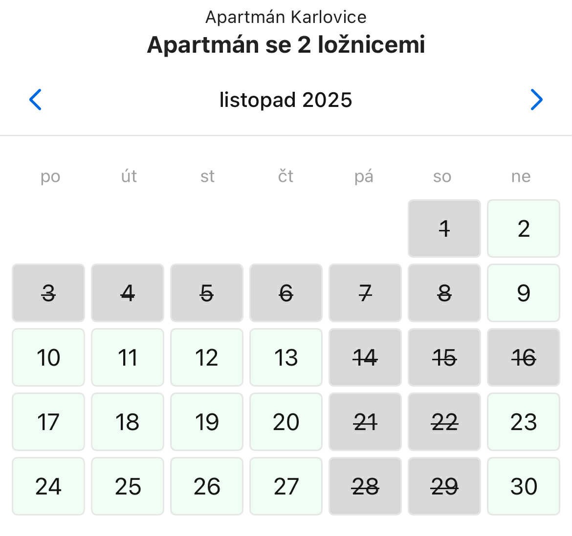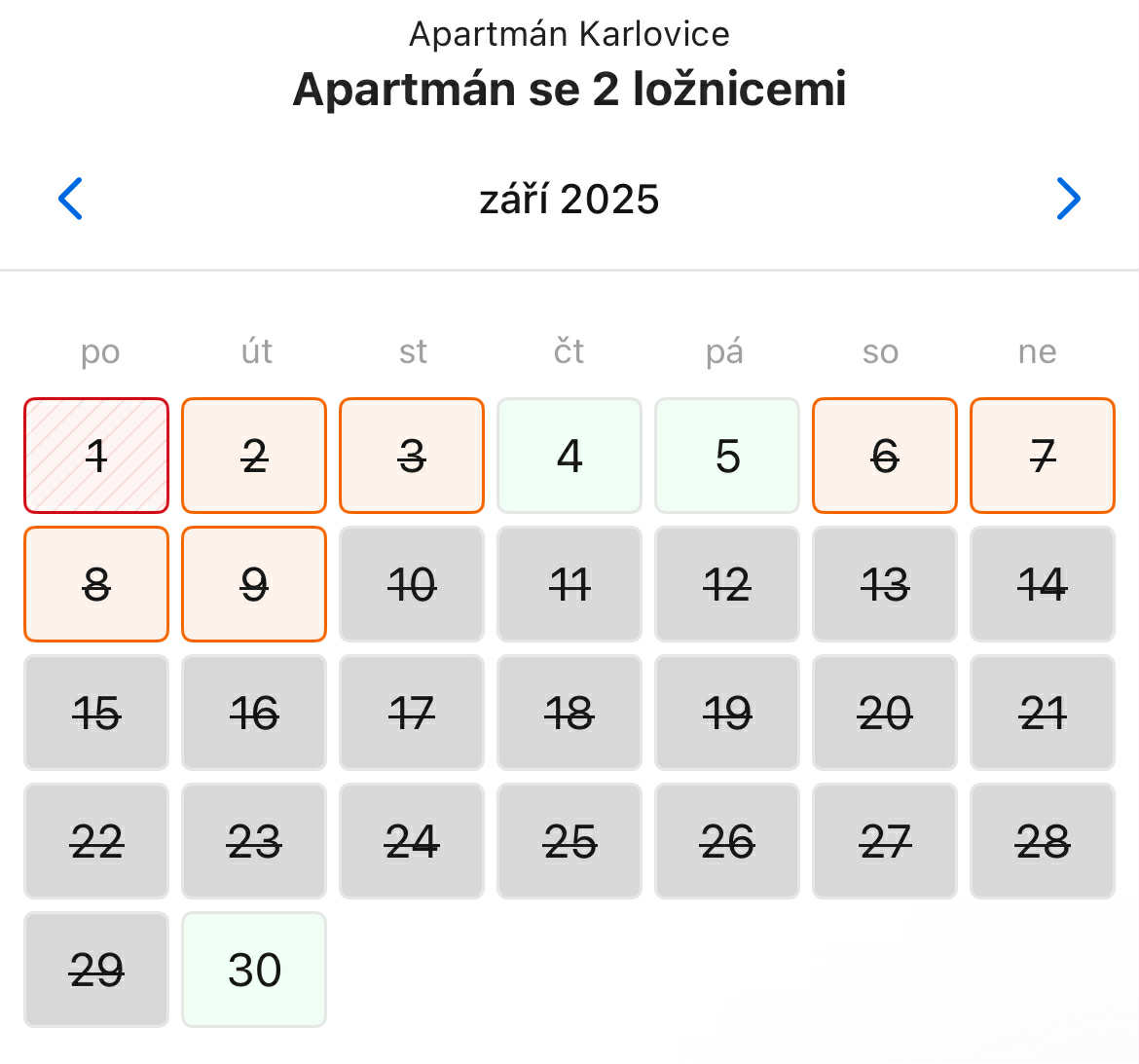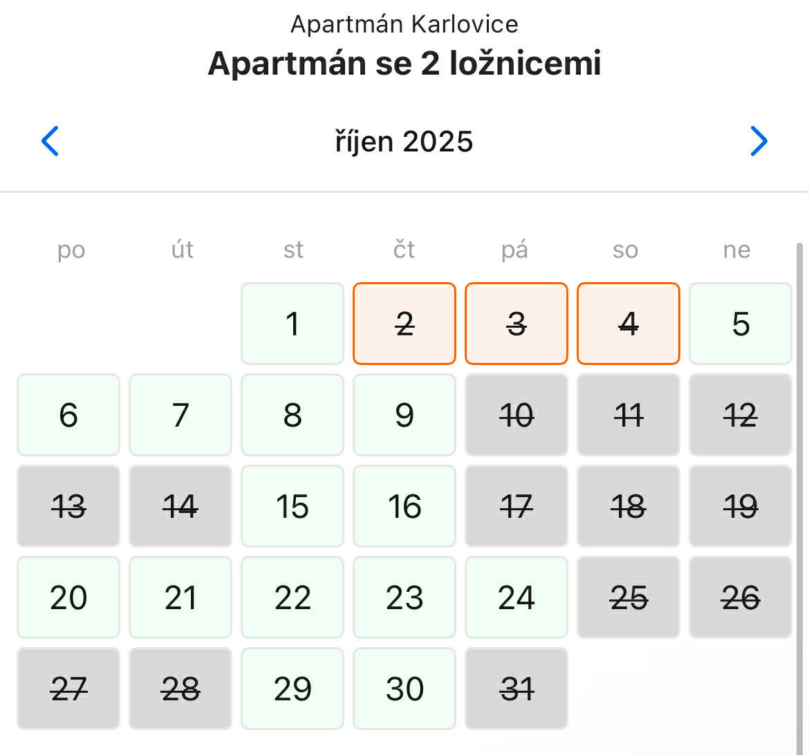 👉 Odjezd ale může být i v den označený šedě nebo červeně, protože ten už je blokovaný pro příjezd dalšího hosta.