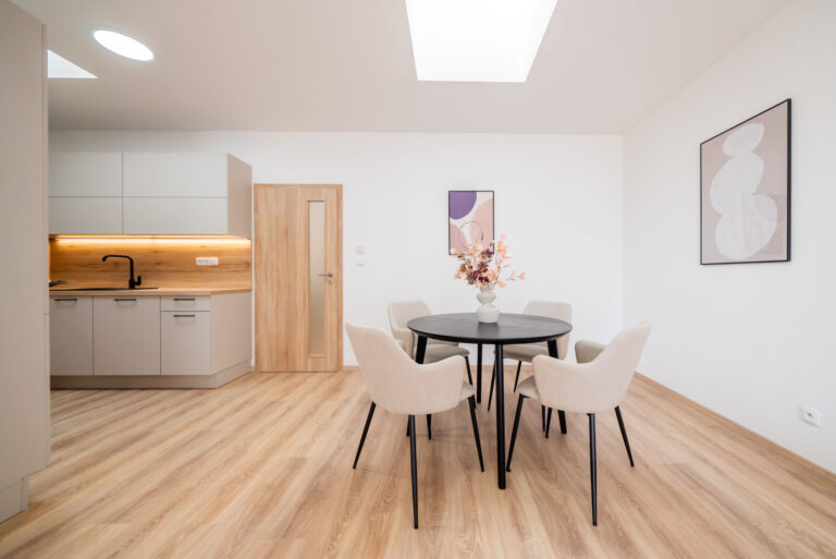 Vznikl jako přístavba na kompletně rekonstruovaném bytovém domě v roce 2025, takže kombinuje moderní standard novostavby s klidným zázemím menšího projektu.