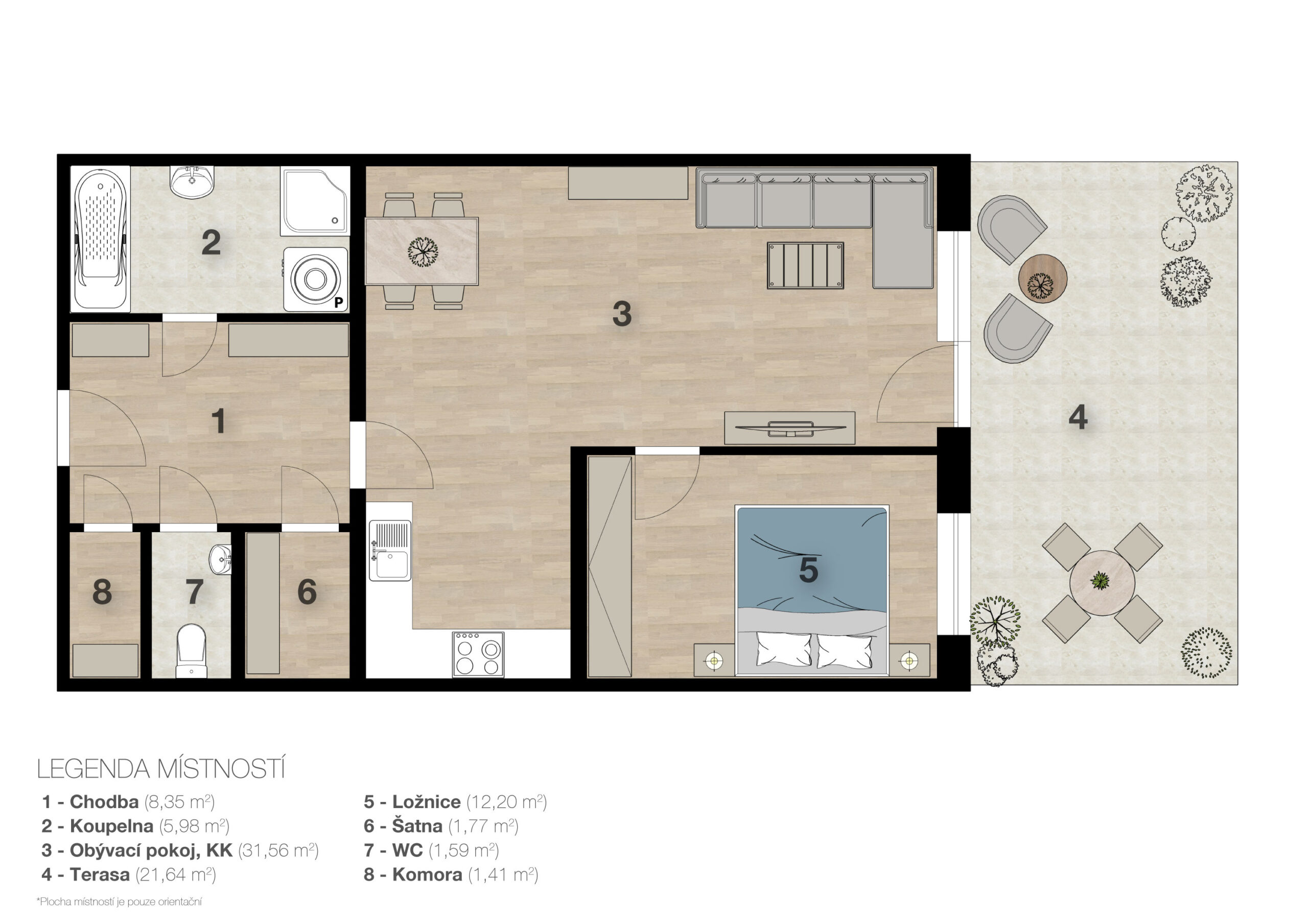 Dispozice 2+kk o velikosti 63 m² je skvěle navržená pro pohodlné bydlení. A pak je tu něco navíc, co dělá tenhle byt opravdu výjimečný – prostorná terasa 22 m² orientovaná na jih 🌞. Místo, kde si ráno dáte kávu na slunci a večer si jen tak odpočinete.