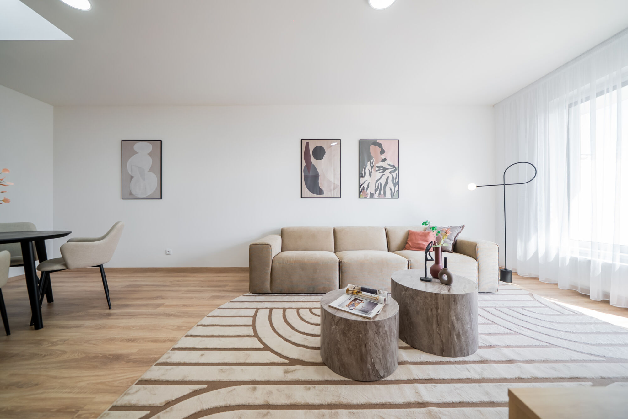 Světlý obývací pokoj s kuchyňským koutem, dvěma světlovody a vstupem na prostornou terasu