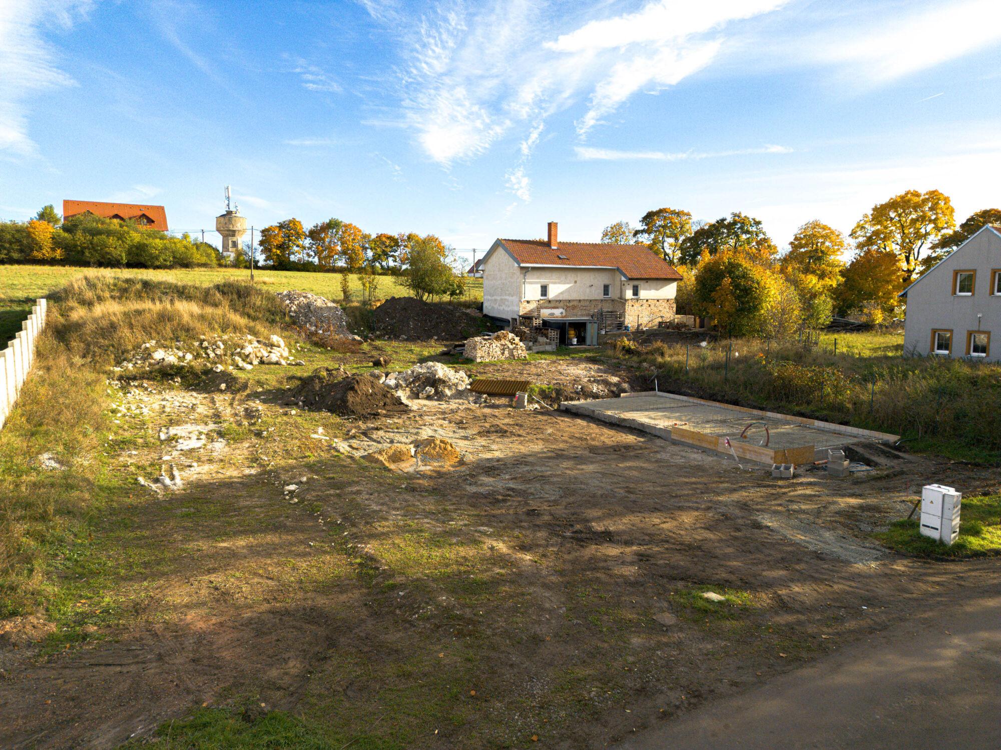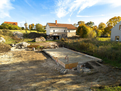 - rovinatý stavební pozemek s hrubou stavbou dvoupodlažního rodinného domu 4+KK a podlahovou plochou 105 m²